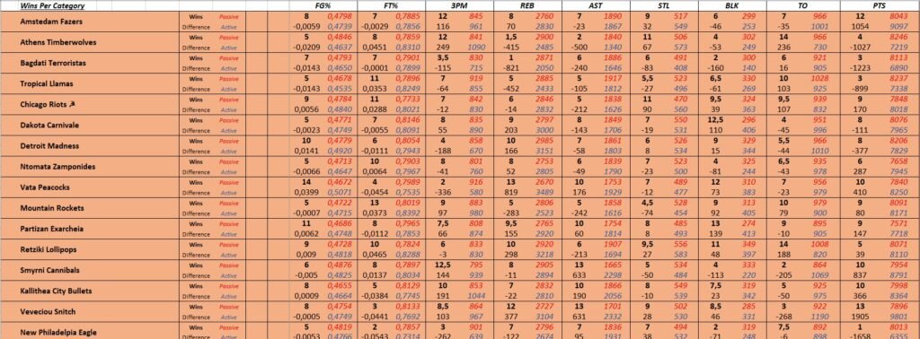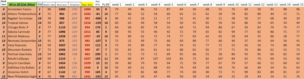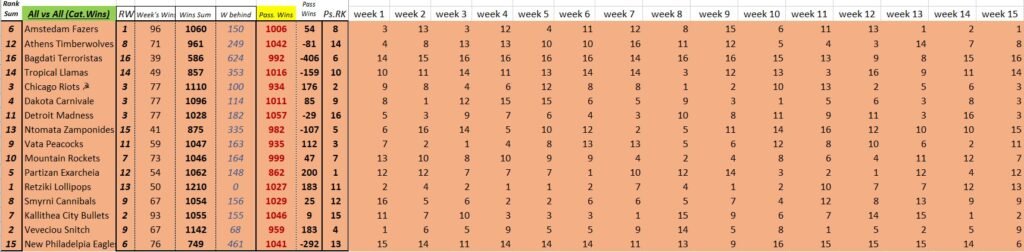WEEK 15 ACTUAL WINS PER CATEGORY / PASSIVE – ACTIVE SUM STATS